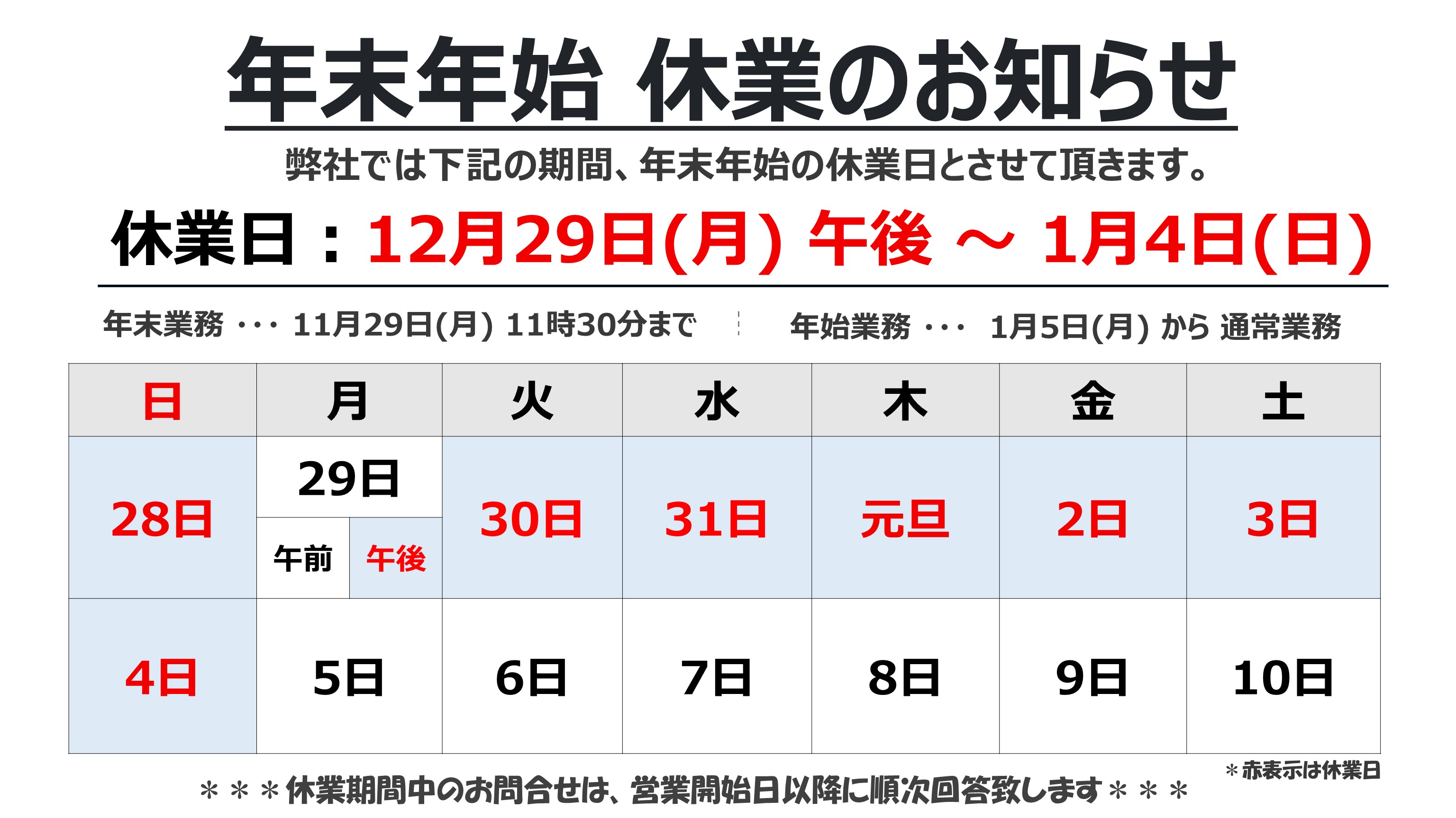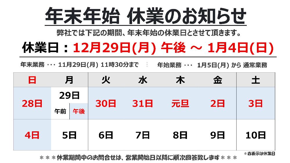 2025年〜2026年 年末年始の営業日(休業日)のお知らせです。 休業日:12月29日(月) 午後 〜 1月4日(日) 年末業務 ・・・ 12月29日(月) 11時30分まで 年始業務 ・・・ 1月5日(月) から 通常業務 年末大掃除の産業廃棄物処分は 株式会社総環 大阪産業廃棄物リサイクルセンターにお任せ下さい。 それでは本日もご安全に!!